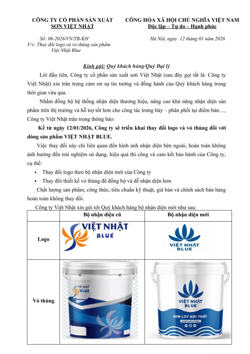 Chúng tôi trân trọng thông báo: kể từ ngày 12/01/2026 , Công ty Cổ phần Sản xuất Sơn Việt Nhật chính thức ra mắt logo và vỏ thùng mới cho nhãn hàng VIỆT NHẬT BLUE .