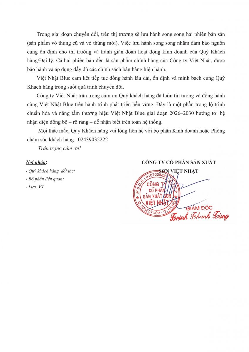 Xem đầy đủ văn bản thông báo thay đổi nhận diện của Công ty Cổ phần Sản xuất Sơn Việt Nhật cho nhãn hàng sơn Việt Nhật Blue: